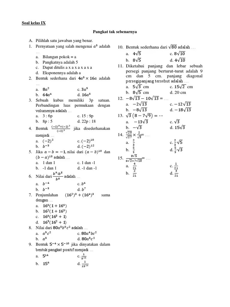 Latihan soal matematika pangkat tak sebenarnya kelas 9 smp . Bilangan pokok dalam suatu perpangkatan disebut basis. Contoh soal matematika kelas 9 bab i perpangkatan dan bentuk akar (matematika kelas ix smp/mts). Video ini membahas latihan soal perpangkatan dan bentuk akar. Terbesar di antara perpangkatan berikut adalah.